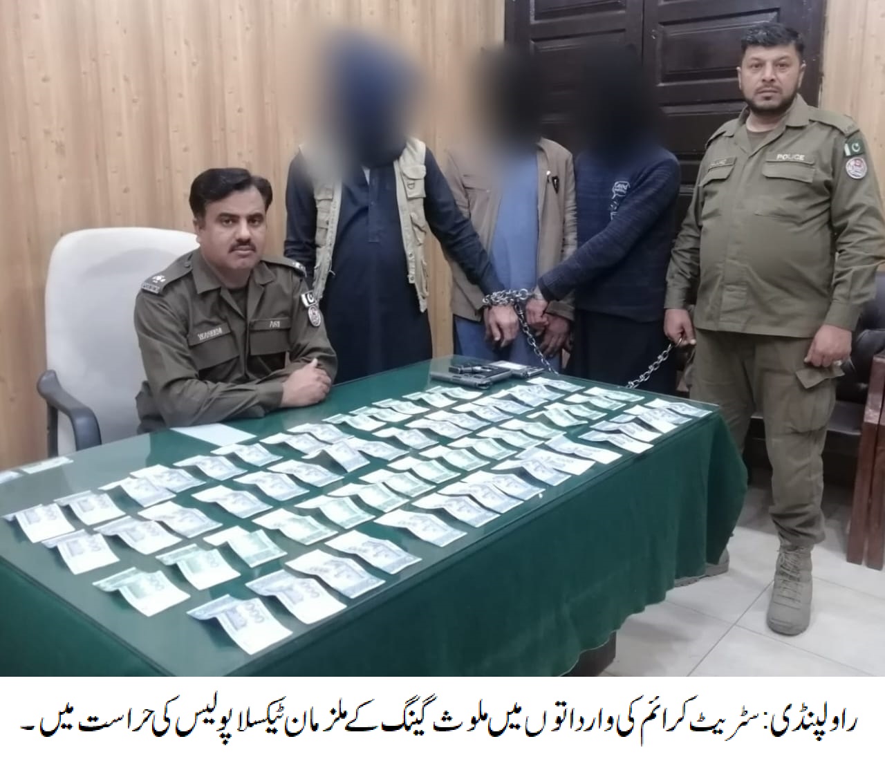 راولپنڈی(کرائم رپورٹر)تھانہ ٹیکسلا نے،سٹریٹ کرائم کی وارداتوں میں ملوث03 رکنی حمزہ گینگ گرفتار،چھینا گیا موٹر سائیکل، موبائل فون،مسروقہ رقم 51 ہزار روپے اور اسلحہ برآمد۔ تفصیلات کے مطابق ٹیکسلا پولیس نے کاروائی کرتے ہوئے سٹریٹ کرائم کی وارداتوں میں ملوث03 رکنی حمزہ گینگ کو گرفتار کرلیا،گرفتار ملزمان میں حمزہ، حبیب اور بہادر شامل ہیں،ملزمان سے چھینا گیا موٹر سائیکل، موبائل فون،مسروقہ رقم 51 ہزار روپے اور اسلحہ برآمدہوا، ملزمان کو متعدد وارداتوں کے انکشاف پر شناخت پریڈ کے لیے جیل منتقل کیا گیا،شناخت پریڈ کے بعد مزید انکشافات متوقع ہیں،ملزمان کی گرفتاری پر ایس پی پوٹھوہار طلحہ ولی نے ایس ایچ او ٹیکسلا اور ٹیم کو شاباش دیتے ہوئے کہا کہ شہریوں کی جان و مال پر حملہ کرنے والے ملزمان قانون کی گرفت سے نہیں بچ سکتے۔