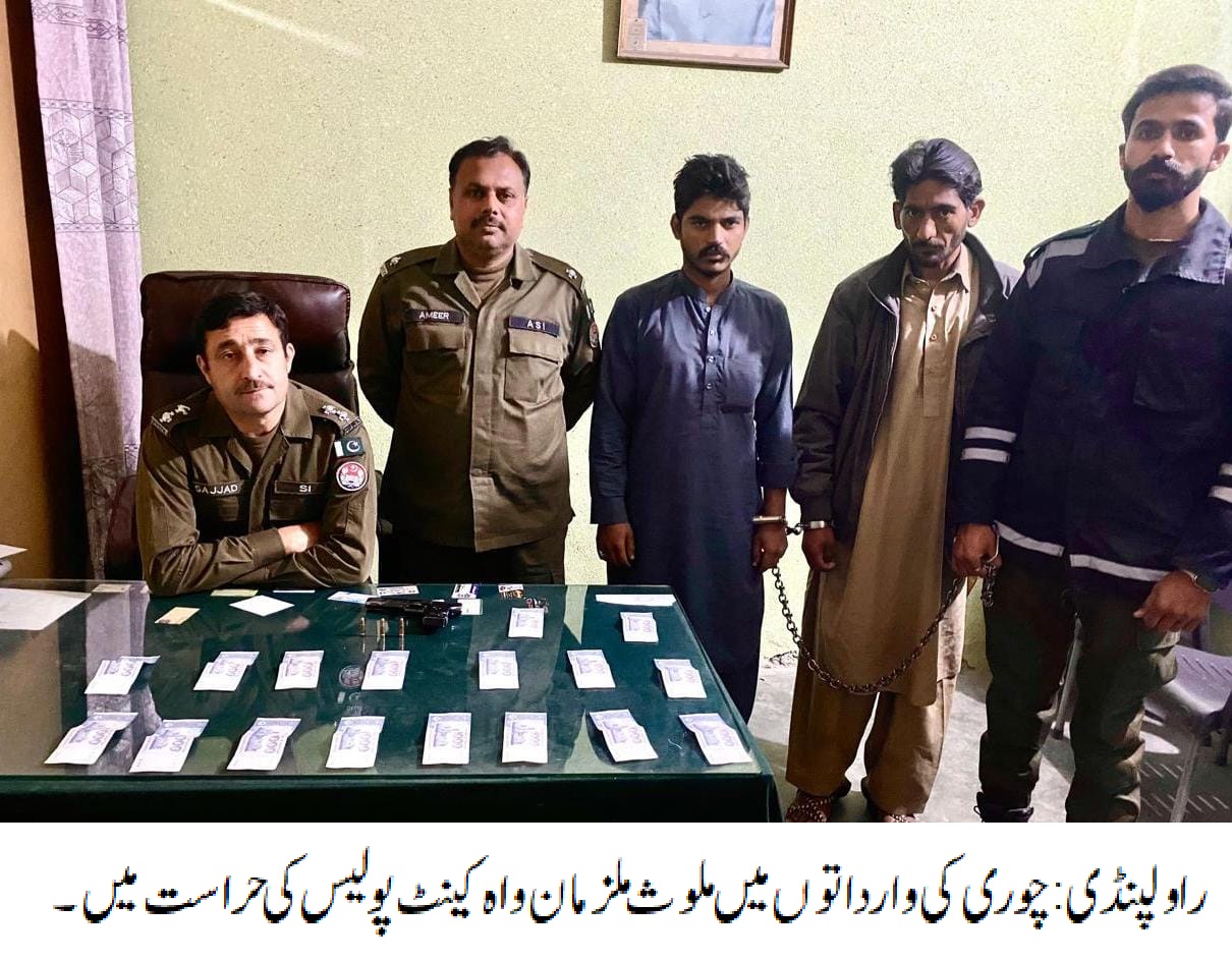 راولپنڈی(کرائم رپورٹر) تھانہ واہ کینٹ نے ،چوری کی وارداتوں میں ملوث 02 ملزمان گرفتار،مسروقہ رقم 13 ہزار روپے اور اسلحہ برآمد۔تفصیلات کے مطابق واہ کینٹ پولیس نے کاروائی کرتے ہوئے چوری کی وارداتوں میں ملوث 02 ملزمان کو گرفتار کرلیا،گرفتار ملزمان میں اویس اور زرعہ شامل ہیں،ملزمان سے مسروقہ رقم 13 ہزار روپے اور اسلحہ برآمدہوا، ایس پی پوٹھوہار طلحہ ولی نے ایس ایچ او واہ کینٹ اور ٹیم کو شاباش دیتے ہوئے کہا کہ شہریوں کی جان و مال کی حفاظت اولین ذمہ داری ہے جس کے لیے تمام وسائل بروئے کارلائے جارہے ہیں۔