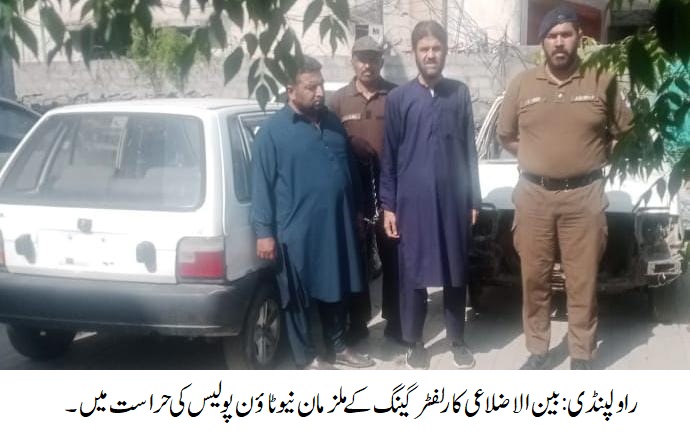 راولپنڈی(کرائم رپورٹر) تھانہ نیو ٹاؤن نے بین الاضلاعی کار لفٹر گینگ کا سرغنہ ساتھی سمیت گرفتار،لاکھوں روپے مالیتی 4 مسروقہ کاریں (کرولا XLI کار اور 3 مہران کاریں) برآمد،ملزمان ماسٹر کی (چابی) کی مدد سے گاڑیاں چوری کرتے تھے،ملزمان گاڑیاں چوری کر کے (کے پی کے) لے جاتے تھے۔ تفصیلات کے مطابق نیو ٹاؤن پولیس نے کارروائی کرتے ہوئے بین الاضلاعی کار لفٹر گینگ کے سرغنہ کو ساتھی سمیت گرفتار کرلیا،گرفتار ملزمان میں سرغنہ حسن جاوید اور فیاض خان شامل ہیں،ملزمان سے لاکھوں روپے مالیتی 4 مسروقہ کاریں (کرولا XLI کار اور 3 مہران کاریں) برآمد ہوئیں،ملزمان ماسٹر کی (چابی) کی مدد سے گاڑیاں چوری کرتے تھے،ملزمان گاڑیاں چوری کر کے (کے پی کے) لے جاتے تھے،ملزمان کو ٹھوس شواہد کے ساتھ چالان عدالت کیا جائے گا،ایس پی راول محمد حسیب راجہ کا کہنا تھا کہ شہریوں کو قیمتی اثاثے سے محروم کرنے والے افراد قانون کی گرفت سے نہیں بچ سکتے۔