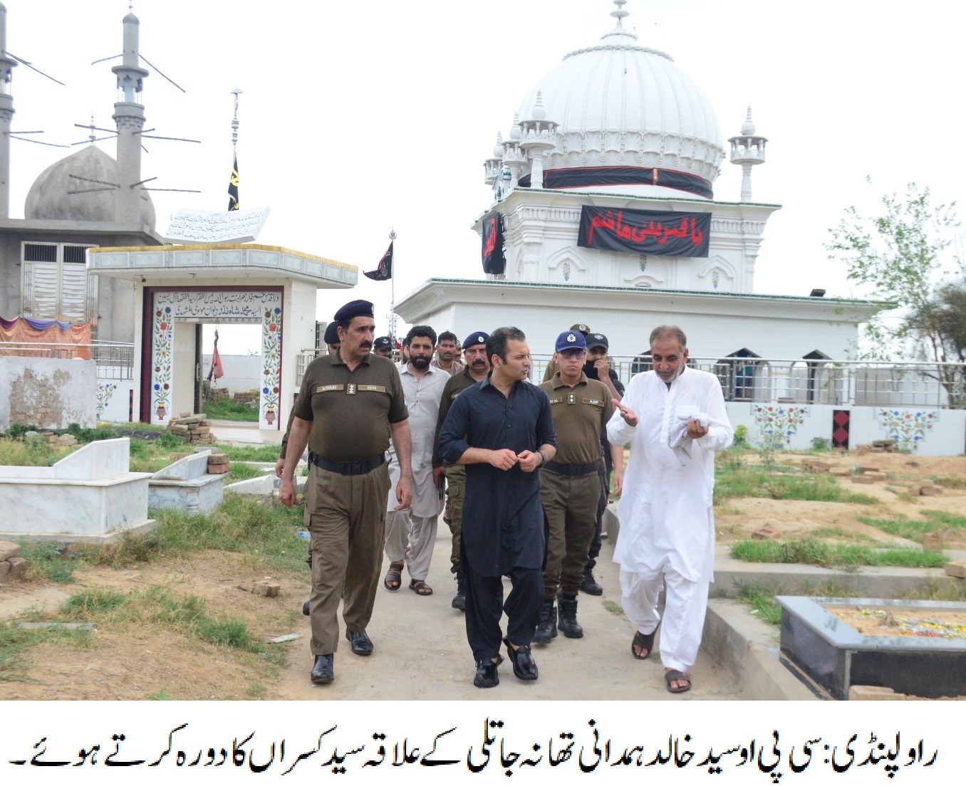 تفصیلات کے مطابق سٹی پولیس آفیسر سید خالد ہمدانی نے تھانہ جاتلی کے علاقہ سید کسراں کا دورہ کیا، ایس ڈی پی او گوجرخان، ایس ایچ او جاتلی اور دیگر افسران بھی ہمراہ تھے، سی پی او نے محرم الحرام کے حوالے سے سکیورٹی انتظامات کا جائزہ لیا اور متعلقہ افسران کو ضروری ہدایات دیں، پنجاب حکومت کے جاری کردہ ضابطہ اخلاق اور سکیورٹی ایس او پیز پر عمل درآمد ہمہ وقت یقینی بنایا جارہا ہے.