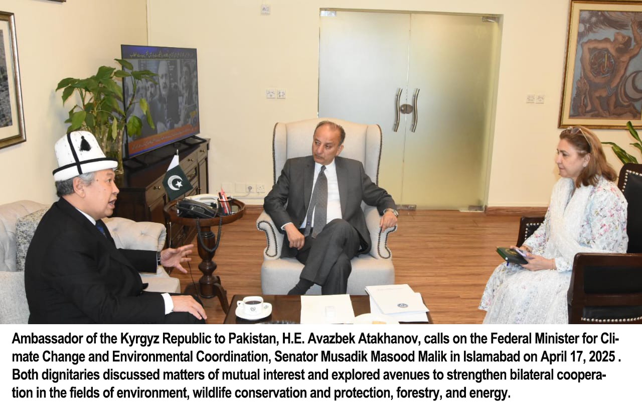 اسلام آباد(نیوز رپورٹر) پاکستان اور کرغزستان کے درمیان ماحولیاتی، جنگلی حیات، جنگلات اور توانائی کے شعبوں میں دوطرفہ تعاون بڑھانے پر اتفاق ، پاکستان-کرغزستان کے درمیان مشترکہ ماحولیاتی چیلنجز سے نمٹنے اور پائیدار ترقی کے اہداف کے حصول کے لیے تعاون کا عزم، کرغزستان کے سفیر نے پاکستان-کرغزستان بین الحکومتی کمیشن اجلاس میں شرکت کے لیے وزیر موسمیاتی تبدیلی مصدق ملک کو باضابطہ دعوت دی ، پاکستان کرغزستان کے ساتھ موسمیاتی موافقت، حیاتیاتی تنوع، جنگلی حیات کے تحفظ اور صاف توانائی میں تعاون بڑھانے کا عہد .