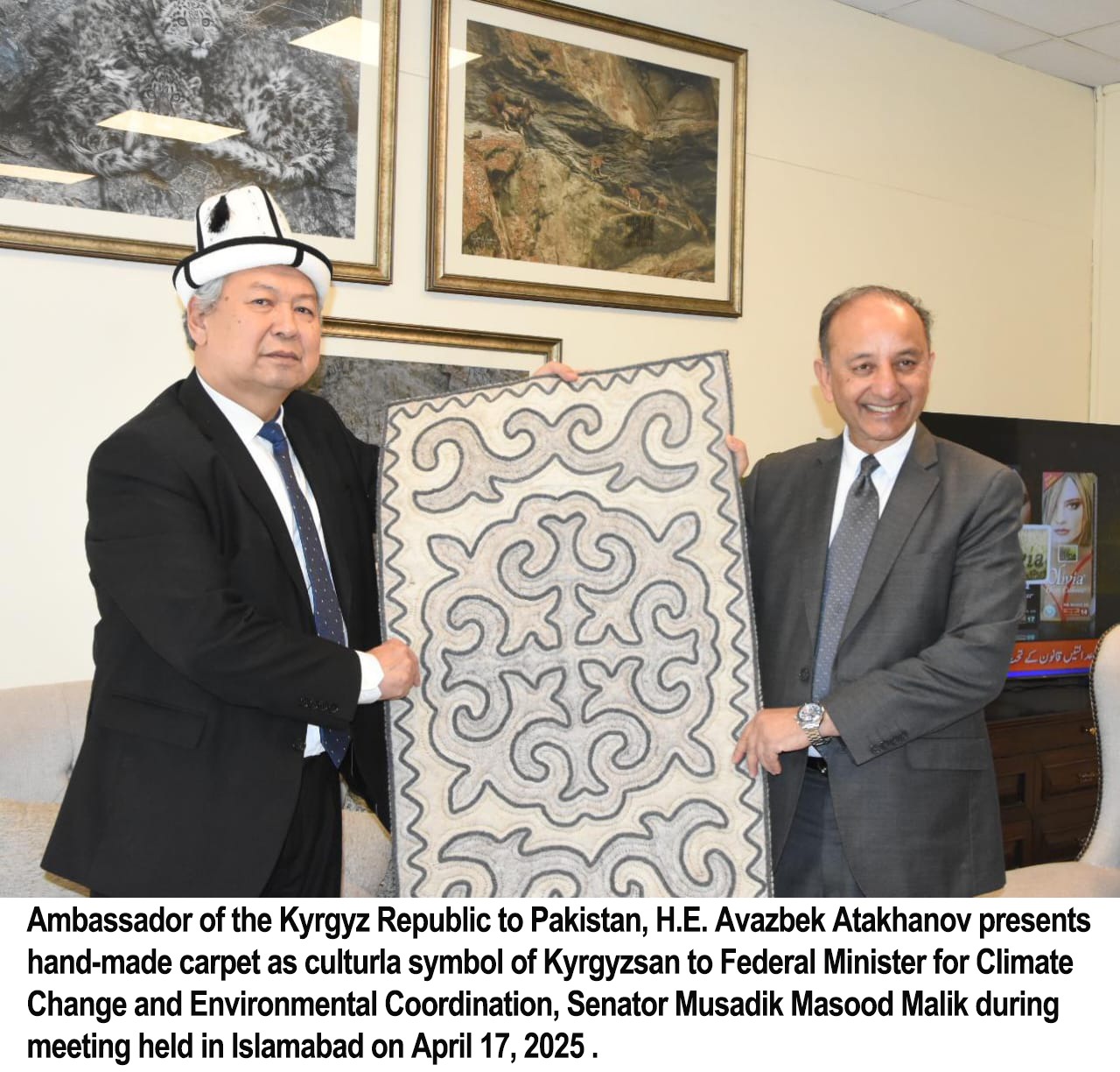 پاکستان اور کرغزستان کے درمیان برفانی چیتے اور مارخور جیسے نایاب پہاڑی جانوروں کے تحفظ کے لیے مشترکہ اقدامات کی ضرورت ، پاکستان کرغزستان کے ساتھ برفانی چیتے اور مارخور کے تحفظ کے لیے سائنسی تحقیق اور کمیونٹی پر مبنی پروگرامز میں تعاون پر زور پاکستان کرغزستان کے درمیان سرحد پار جنگلی حیات کے تحفظ کے لیے تکنیکی تبادلوں اور مشترکہ منصوبوں کی تجویز پاکستان اور کرغزستان کے درمیان ماحولیاتی تبدیلی اور مسکن کی تباہی کے اثرات کو کم کرنے کے لیے تعاون کا عزم پاکستان کرغزستان کے درمیان گلوبل اسنو لیپرڈ اینڈ ایکوسسٹم پروٹیکشن پروگرام (GSLEP) کے تحت باہمی تعاون کے امکانات پر بات چیت پاکستان اور کرغزستان کے درمیان مشترکہ فنڈنگ اور تحفظاتی اقدامات پر اتفاق.