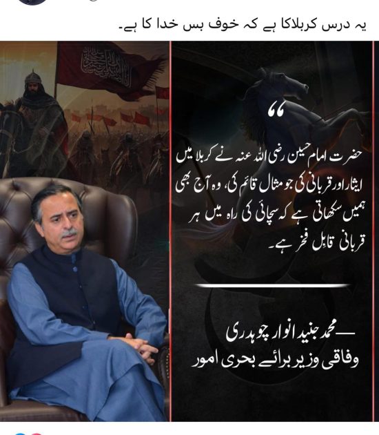 اسلام آباد (سٹاف رپورٹر )وفاقی وزیر بحری امور، محمد جنید انوار چوہدری کا واقعہ کربلا کے موقع پر پیغام وفاقی وزیر محمد جنید انوار چوہدری نے کہا کہ یہ درس کربلا کا ہے کہ خوف بس خدا کا ہے امام حسینؓ کی قربانی ہمیں حق اور سچ پر ڈٹ جانے کا حوصلہ دیتی ہے کربلا ایثار، قربانی اور حق گوئی کی روشن مثال ہے حق کی راہ میں دی جانے والی ہر قربانی باعثِ فخر ہے حضرت امام حسینؓ نے ظلم کے سامنے جھکنے کے بجائے حق کا علم بلند کیا۔