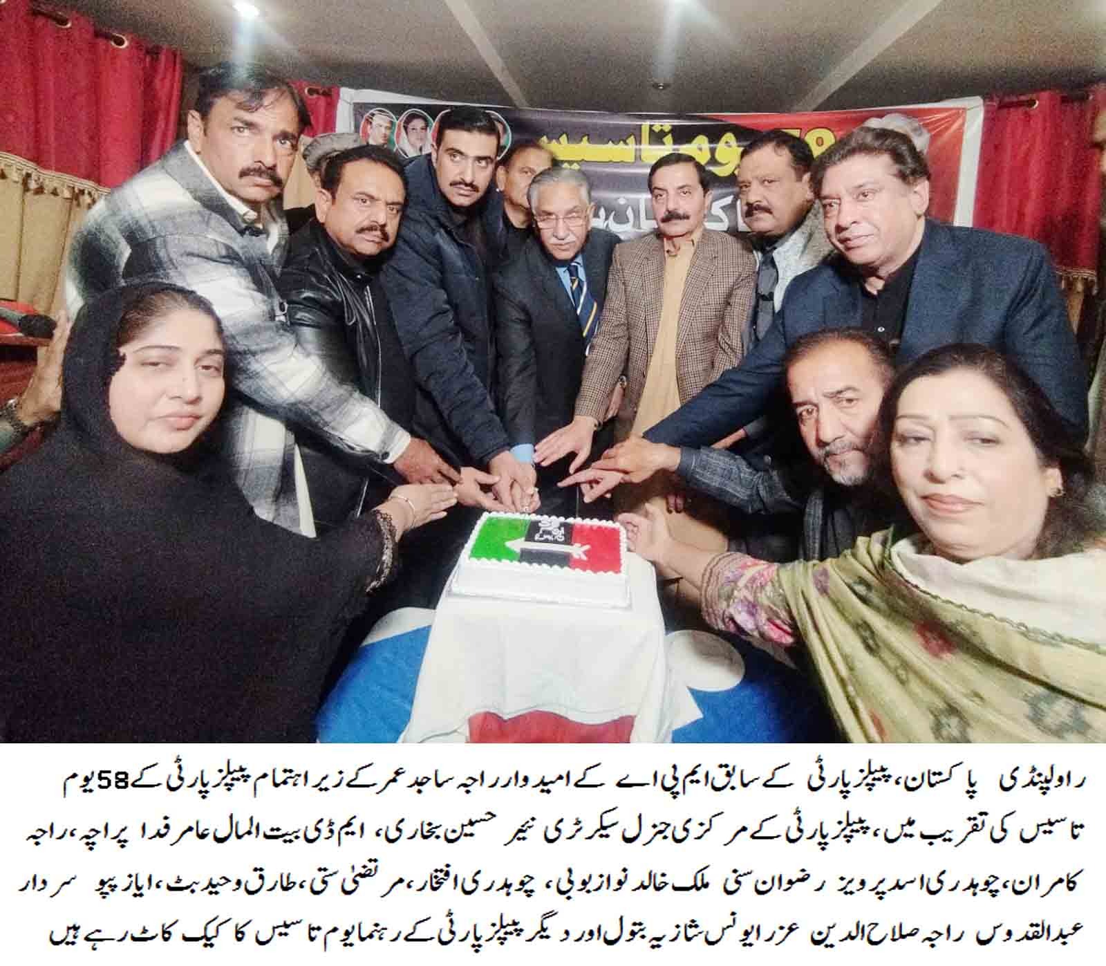 راولپنڈی(سٹاف رپورٹر ) پاکستان، پیپلز پارٹی کےسابق ایم پی اے کے امید وار راجہ ساجد عمر کے زیر اہتمام پیپلز پارٹی کے 58 یوم تاسیس کی تقریب میں ، پیپلز پارٹی کےمرکزی جنرل سیکرٹری نئیر حسین بخاری ، ایم ڈی بیت المال عامر فدا پراچہ ، راجہ کامران ، چوہدری اسد پرویز رضوان سنی ملک خالد نواز بوبی ، چوہدری افتخار ، مرتضیٰ ستی ، طارق وحید بٹ ،ایاز پپو سردار عبدالقدوس راجہ صلاح الدین عزرا یونس شازیہ بتول اور دیگر پیپلز پارٹی کے رہنما یوم تاسیس کا کیک کاٹ رہے ہیں