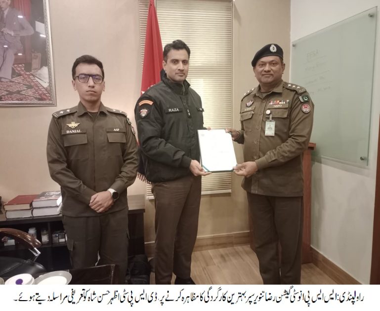 سب انسپکٹر ممتاز،اے ایس آئی حماد منیر، اے ایس آئی محمد جمیل، اے ایس آئی اختر نواز، ہیڈ کانسٹیبل کامران حسین، ہیڈکانسٹیبل ذیشان راشد،ہیڈ کانسٹیبل محمد نیاز خان، کانسٹیبل انجم ریاض،کانسٹیبل محسن علی،کانسٹیبل محمد زوار نذر کو تعریفی سرٹیفکیٹس دئیے،ایس ایس پی انوسٹیگیشن رضا تنویر سپرا کا کہنا تھا کہ شہریوں کی جان ومال کا تحفظ اور جرائم کی روک تھام اولین ذمہ داری ہے۔