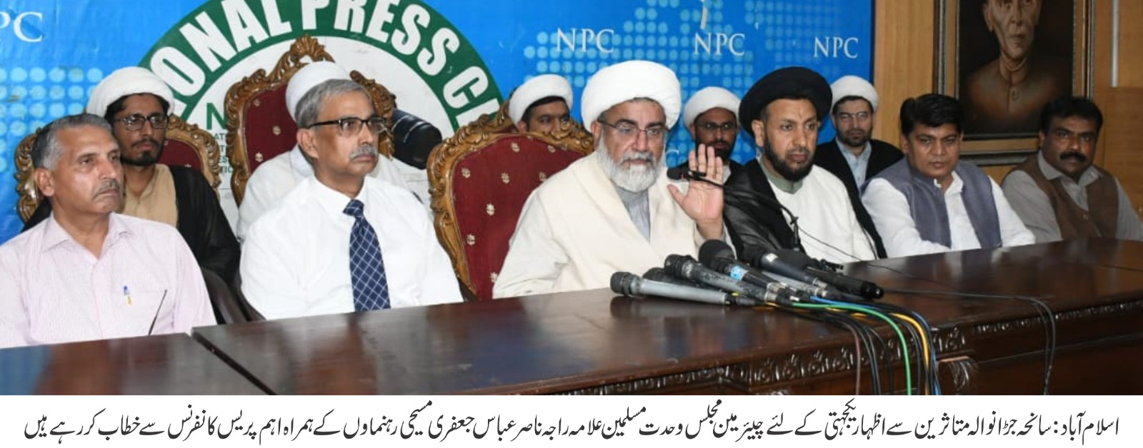 اسلام آباد ( سی این پی ) چیئرمین مجلس وحدت مسلمین پاکستان علامہ راجہ ناصر عباس جعفری کی سانحہ جڑانوالہ کے متاثرین سے اظہار یکجہتی کے لیے پریس کانفرنس، جس میں مسیحی رہنما شاعر ادیب شہباز چوہان،ایڈوکیٹ روتھ رخسانہ،ایگزیکٹو ڈائریکٹر یونائٹڈ کونسل آف چرچز اسلام آباد سیمسن سہیل،صدر مینارٹیز الائنس پاکستان آصف جان،بشپ آف پینٹ کوسٹل چرچ خالد پرویز سمیت ایم ڈبلیو ایم کے مرکزی رہنما شریک ہوئے۔