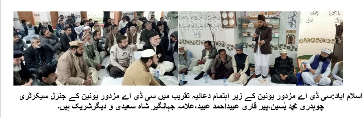 تقریب میں قرآنی آیات کی تلاوت، نعت خوانی اور دعائیہ کلمات کے ذریعے مرحومین کے ایصالِ ثواب کے لیے خصوصی دعا کی گئی۔ اس موقع پر سی ڈی اے مزدور یونین کے قائدین اور مرکزی عہدیداران نے کہا کہ انسان کا کوئی نعم البدل نہیں ہوتا، اور ان کی کمی پوری کرنا ممکن نہیں۔ آج سی ڈی اے مزدور یونین اپنے مخلص، محنتی اور دیرینہ ساتھیوں سے محروم ہو گئی ہے انہوں نے کہا کہ سی ڈی اے مزدور یونین اپنے اُن تمام مخلص کارکنوں کو خراجِ تحسین پیش کرتی ہے جو اپنی زندگی میں یونین اور مزدوروں کے حقوق کی جدوجہد میں پیش پیش رہے، اور ان کی قربانیوں اور خدمات کو ہمیشہ سنہری حروف میں یاد رکھا جائے گا۔تقریب کے اختتام پر مرحومین