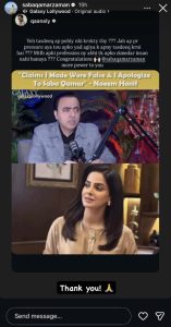 پوڈکاسٹ کے دوران صحافی نے اعتراف کیا کہ 3 نومبر کو ان کے چینل پر صبا قمر سے متعلق ایک ویڈیو اپ لوڈ کی گئی تھی، جس میں انہوں نے غلط طور پر یہ دعویٰ کیا کہ اداکارہ لاہور میں کسی شخص کے ساتھ لیو اِن ریلیشن شپ میں رہ رہی ہیں۔ بعد ازاں خبر کی تصدیق پر انہیں معلوم ہوا کہ یہ دعویٰ بے بنیاد اور حقائق کے خلاف تھا نعیم حنیف نے تسلیم کیا کہ ان کے بیان سے اداکارہ کے جذبات مجروح ہوئے اور ان کی ساکھ کو نقصان پہنچا، جس پر انہوں نے دل سے معذرت کی ان بیانات کے بعد صبا قمر نے صحافی کو قانونی نوٹس بھجوایا اور اس کے اسکرین شاٹس اپنی انسٹاگرام اسٹوریز پر بھی شیئر کیے۔ اداکارہ کا کہنا تھا کہ انہوں نے ایسے صحافی کے خلاف قانونی کارروائی کی ہے جس نے ان کے بارے میں جھوٹے اور بے بنیاد الزامات پھیلائے۔