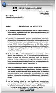 قانونی نوٹس میں مؤقف اختیار کیا گیا کہ صحافی کے بیانات نہ صرف صحافتی اخلاقیات کی خلاف ورزی ہیں بلکہ صنفی تعصب اور رجعت پسند سوچ کو بھی فروغ دیتے ہیں، جہاں خواتین کی کامیابی کو ان کی محنت کے بجائے ذاتی تعلقات سے جوڑا جاتا ہے ، اداکارہ صبا قمر نے معافی پر ردِعمل دیتے ہوئے پوڈکاسٹ کا اسکرین شاٹ اپنی انسٹاگرام اسٹوری پر شیئر کیا اور واضح کیا کہ جھوٹے الزامات کے خلاف قانونی کارروائی ناگزیر ہے۔ انہوں نے شوبز انڈسٹری اور عوام سے بھی اپیل کی کہ بدنامی اور بے ادبی کے خلاف آواز بلند کی جائے اور ایسے عناصر کو جواب دہ بنایا جائے ، بعد ازاں متنازع پوڈکاسٹ ویڈیو صحافی کے چینل سے ہٹا دی گئی۔